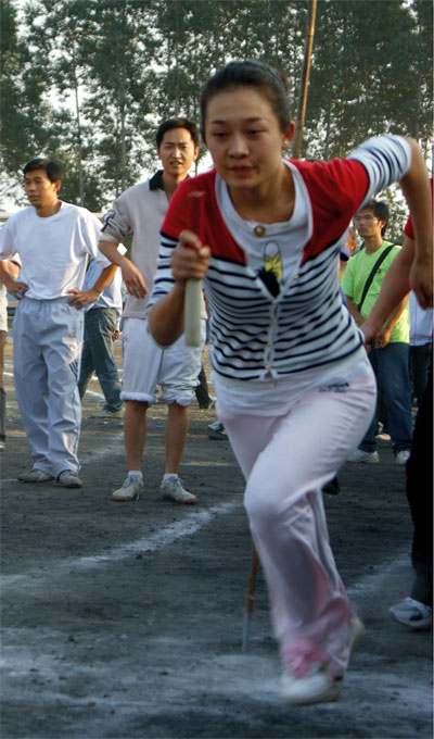 專業(yè)課老師楊婷在教工10乘60米接力折返跑比賽中奮勇爭先