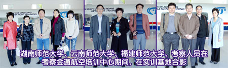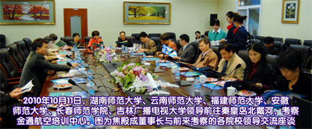 本報(bào)訊 2010年10月11日,為交流商談校企合作開辦民航空乘專業(yè)事宜,推動(dòng)和加強(qiáng)合作辦學(xué)事業(yè),湖南師范大學(xué)、云南師范大學(xué)、福建師范大學(xué)、長春師范學(xué)院、吉林廣播電視大學(xué)等單位派出精干人員,前往旅游避暑勝地北戴河,考察華北民航培訓(xùn)中心/金通航空培訓(xùn)中心,一行18人在金通航空培訓(xùn)董事長兼總經(jīng)理焦殿成先生、金通航空培訓(xùn)副總經(jīng)理兼就業(yè)工作部總經(jīng)理馬強(qiáng)先生、金通航空培訓(xùn)副總經(jīng)理兼院校教學(xué)工作部總經(jīng)理、培訓(xùn)中心總經(jīng)理盛美蘭女士、金通航空培訓(xùn)董事長助理兼綜管部總經(jīng)理付曉軍先生的陪同下,受到了熱烈歡迎。