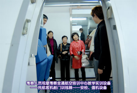 考察人員在金通航空培訓(xùn)中心考察交流期間,聽取了金通航空培訓(xùn)中心介紹,交流了空乘人才培養(yǎng)模式及經(jīng)驗(yàn),參觀考察金通航空培訓(xùn)中心整體環(huán)境,參觀了民航客機(jī)模擬訓(xùn)練艙、艙門訓(xùn)練器、安檢實(shí)操室、CBT教學(xué)軟件和教室等。