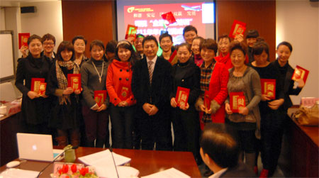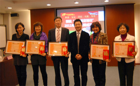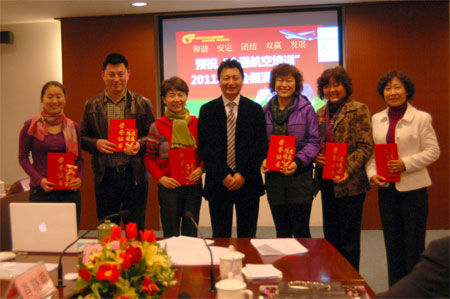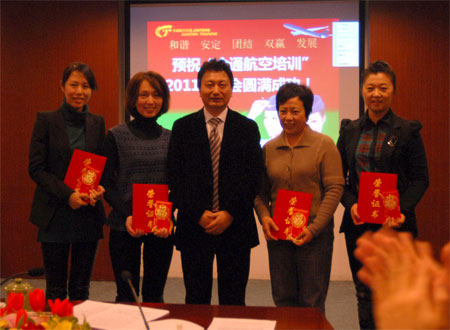 年會確定了“和諧、安定、團結(jié)、雙贏、發(fā)展”這一主題!和諧——就是要在校企合作辦學(xué)過程中攜手并進、求同存異、協(xié)調(diào)發(fā)展;安定——就是要在教育教學(xué)、學(xué)生管理、日常行為上做到安全穩(wěn)定;團結(jié)——就是要求公司的全體員工同心同德、共克時艱、榮辱與共、認同向上;雙贏——就是在公司的經(jīng)營運行中,以保證合作院校、企業(yè)、學(xué)生的根本利益為最高職責(zé),實現(xiàn)雙贏或者多贏;發(fā)展——永遠是思維和籌劃工作的前提,是關(guān)系公司和每一位員工利益和承擔社會責(zé)任基礎(chǔ),是實現(xiàn)理想、奔向目標和開拓前進的支撐”。 公司法人和董事長焦殿成先生,首先代表“金通航空培訓(xùn)”,祝愿各位員工在2011年好運常在、健康快樂!向一年來辛勤工作的各位員工致以誠摯的的謝意! 2010年,是公司建設(shè)與發(fā)展歷程中極不平凡的一年,也是公司科學(xué)奮進、開拓創(chuàng)新、安定平穩(wěn)、大有作為的一年。在這一年里,我們以科學(xué)發(fā)展觀為主線,堅持“向市場化、規(guī)范化運演,向集團化、特色化提升”的目標,同心協(xié)力,克艱奮進,圍繞重點推進,抓住關(guān)鍵突破,集中資源攻堅,創(chuàng)開重圍奮進,提高了企業(yè)的執(zhí)行力、凝聚力、競爭力,展示了“金通航空培訓(xùn)”的特色風(fēng)采,實現(xiàn)了公司持續(xù)穩(wěn)定發(fā)展。2010年,在全體員工的共同努力下,完成了合作院?粘藢I(yè)的招生計劃,共組織空乘專業(yè)學(xué)生參加航空公司面試56次,涉及16家航空公司,空中就業(yè)學(xué)生635人,組織地面面試21次,涉及13個機場等單位,地面就業(yè)人數(shù)569名;在進一步推進和加強合作院校良好關(guān)系的基礎(chǔ)上,又加大了合作院校擴展和企業(yè)經(jīng)營模式的適時轉(zhuǎn)型,先后與云南師范大學(xué)、安徽師范大學(xué)、長春師范學(xué)院簽訂了《合作辦學(xué)協(xié)議》?傊,2010年,招生工作部統(tǒng)領(lǐng)招生工作全局,積極想辦法,認真做工作,自覺給壓力,保證了公司招生工作任務(wù)的落實。就業(yè)工作部想方設(shè)法,克艱開拓,積極組織合作院?粘藢I(yè)學(xué)生參加航空公司、機場地面等招聘面試,足跡遍及北京、上海、廣州等地域,取得了較好業(yè)績;院校教學(xué)工作部加大了專業(yè)課教學(xué)力度,嚴格了教學(xué)設(shè)備及師資管理,進行了專業(yè)教材的編寫,為公司合作辦學(xué)事業(yè)的健康發(fā)展貢獻了力量。培訓(xùn)中心精細管理,努力開源節(jié)流和增收節(jié)支,完成了全年的培訓(xùn)任務(wù);綜合管理部樹立安全、服務(wù)、保障意識,發(fā)揮了橋梁紐帶作用。駐院校工作處立足崗位,恪盡職守,履職盡責(zé),思緒在一線,工作在一線,加強了與合作院校的協(xié)調(diào)溝通、學(xué)生的教學(xué)管理和就業(yè)指導(dǎo),很好地履行了公司在合作辦學(xué)事業(yè)中的權(quán)利與義務(wù)。可以說,2010年是“金通航空培訓(xùn)”的穩(wěn)定之年、安全之年、發(fā)展之年! 年會對五個先進集體、6名優(yōu)秀管理干部、6名優(yōu)秀教員和23名優(yōu)秀員工進行了表彰。重新聘任了2011年度管理崗位中層以上干部。