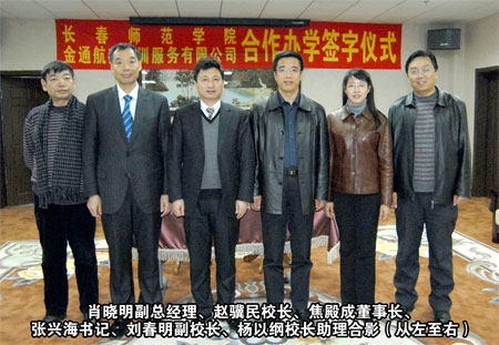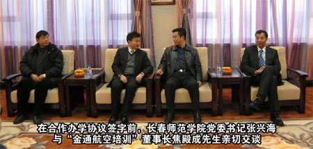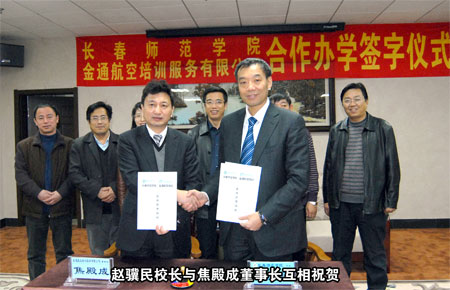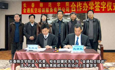 合作雙贏、共謀事業(yè)、科學(xué)發(fā)展 長(zhǎng)春師范學(xué)院與“金通航空培訓(xùn)” 簽訂合作辦學(xué)協(xié)議 本報(bào)訊 高校和企業(yè)合作培養(yǎng)人才是一種新型的育才模式,通過(guò)校企合作可以為大學(xué)生提供良好的培養(yǎng)教育和實(shí)習(xí)場(chǎng)所,構(gòu)建起高校畢業(yè)生成才就業(yè)的橋梁。為了填補(bǔ)吉林省高校中本科空乘專業(yè)的空白,提升長(zhǎng)春師范學(xué)院和“金通航空培訓(xùn)”的辦學(xué)模式及社會(huì)影響力,2010年 12月15日下午,長(zhǎng)春師范學(xué)院與“金通航空培訓(xùn)”合作辦學(xué)簽字儀式在長(zhǎng)春隆重舉行。長(zhǎng)春師范學(xué)院黨委書記張興海、校長(zhǎng)趙驥民、副校長(zhǎng)劉春明、校長(zhǎng)助理?xiàng)钜跃V以及學(xué)院教務(wù)處、招生辦領(lǐng)導(dǎo),金通航空培訓(xùn)服務(wù)有限公司董事長(zhǎng)兼總經(jīng)理焦殿成、副總經(jīng)理兼招生工作部總經(jīng)理肖曉明、董事長(zhǎng)助理兼綜合管理部總經(jīng)理付曉軍,參加了合作辦學(xué)簽字儀式。
