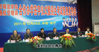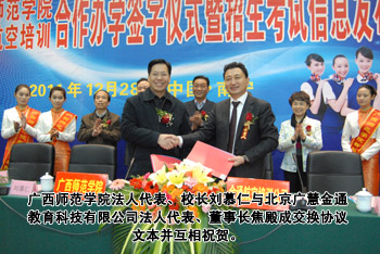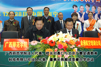 本網(wǎng)訊:伴隨著新年的鐘聲,在2011年即將渡過之際的12月28日,廣西師范學(xué)院文星樓報(bào)告廳充滿了節(jié)日的喜慶氣氛。在這里,廣西師院與北京廣慧金通教育科技有限公司舉行了合作辦學(xué)簽字儀式暨招生考試信息發(fā)布會(huì)。廣西師范學(xué)院黨委書記劉力、院長(zhǎng)劉慕仁,北京廣慧金通教育科技有限公司董事長(zhǎng)兼總經(jīng)理焦殿成、副總經(jīng)理兼院校教學(xué)工作部總經(jīng)理盛美蘭,以及受邀參加的中國(guó)南方航空、中國(guó)東方航空、廈門航空、深圳航空、長(zhǎng)榮航空等各航空公司領(lǐng)導(dǎo)蒞臨觀摩了本次簽約儀式。廣西師范學(xué)院各部門領(lǐng)導(dǎo)以及09、10級(jí)新聞傳播學(xué)院的近300名師生列席了簽約儀式。簽約儀式由廣西師范學(xué)院黨委副書記、紀(jì)委書記梁半農(nóng)主持。 廣西師范學(xué)院與北京廣慧金通教育科技有限公司合作開辦的播音與主持藝術(shù)(空中乘務(wù)方向)專業(yè),是廣西自治區(qū)高校中唯一招收空中乘務(wù)藝術(shù)類本科的專業(yè),填補(bǔ)了廣西壯族自治區(qū)在本科學(xué)歷層次空乘人才培養(yǎng)上的空白。而對(duì)于“學(xué)高為師,身正為范”的師范類院校來說,肩上重任更是非同一般。廣西師范學(xué)院,自1953年建校以來,就始終秉承著“德才并育,知行合一”的校訓(xùn),厚德載物,迅猛發(fā)展。 簽約儀式開始,梁半農(nóng)副書記宣讀了廣西壯族自治區(qū)教育廳關(guān)于廣西師范學(xué)院與北京廣慧金通教育科技有限公司合作辦學(xué)的批文。 隨后,廣西師范學(xué)院法人代表、校長(zhǎng)劉慕仁與北京廣慧金通教育科技有限公司法人代表、董事長(zhǎng)焦殿成簽署辦學(xué)協(xié)議。 廣西師范學(xué)院招生就業(yè)處陳宗武處長(zhǎng)詳細(xì)地介紹了空乘專業(yè)的學(xué)科建設(shè)、發(fā)展、招生情況、招生原則、招生計(jì)劃、報(bào)告條件及報(bào)考須知等情況。 劉力書記代表廣西師范學(xué)院對(duì)出席本次儀式的嘉賓表示熱烈歡迎。劉力書記指出,與金通航空培訓(xùn)聯(lián)合開辦本科層次空乘專業(yè),這是符合雙方及中國(guó)民航業(yè)發(fā)展需要、開拓創(chuàng)新、搶抓機(jī)遇的科學(xué)決策;是充分發(fā)揮各處資源優(yōu)勢(shì),實(shí)現(xiàn)雙方互惠共贏的先進(jìn)意識(shí),進(jìn)一步拓寬學(xué)校人力物力資源渠道、增強(qiáng)學(xué)校在社會(huì)的影響力。他希望此次校企合作,雙方應(yīng)秉承真誠(chéng)合作、互利互惠、共同發(fā)展的原則,共同努力、共同見證空乘專業(yè)的成長(zhǎng)和壯大,把空乘專業(yè)發(fā)展成為我校及廣西高校的品牌專業(yè)。 董事長(zhǎng)焦殿成在簽約儀式上致辭。他說,廣西是美麗的八桂之地,奇特的喀斯特地貌,燦爛的文物古跡,濃郁的民族風(fēng)情,使廣西獨(dú)具魅力!作為全國(guó)重要僑鄉(xiāng)、祖國(guó)的南大門,也是連接我國(guó)與東盟國(guó)家的橋頭堡,特殊的地形地貌和豐富的旅游資源為民航業(yè)的發(fā)展提供了優(yōu)越的條件。廣西壯族自治區(qū)現(xiàn)有8個(gè)民用機(jī)場(chǎng),已經(jīng)開辟了約170條航線,共有34家國(guó)內(nèi)外航空公司進(jìn)駐廣西市場(chǎng),航線網(wǎng)絡(luò)通達(dá)國(guó)內(nèi)多個(gè)發(fā)達(dá)地區(qū)和港澳臺(tái)地區(qū),覆蓋除文萊以外的其他東盟國(guó)家。而“十二五”時(shí)期,廣西提出了實(shí)現(xiàn)“富民強(qiáng)桂”的跨越目標(biāo),將繼續(xù)把民航建設(shè)放在交通建設(shè)的突出位置,計(jì)劃投入170億元建設(shè)15個(gè)重大民航項(xiàng)目。面對(duì)祖國(guó)民航業(yè)快速發(fā)展的有利契機(jī),校企之間真誠(chéng)合作,攜手培養(yǎng)民航業(yè)發(fā)展所需要的高端人才,將是高等院校和企業(yè)科學(xué)發(fā)展的的必由之路、創(chuàng)新之路和希望之路。 “十年樹木百年樹人”,作為肩負(fù)著國(guó)家科學(xué)發(fā)展基礎(chǔ)性工程的高等院校,在人才培養(yǎng)上更應(yīng)首當(dāng)其沖、責(zé)任重大。北京廣慧金通教育科技有限公司與廣西師范學(xué)院采用校企合作辦學(xué)模式,共同開辦本科層次的播音與主持藝術(shù)專業(yè)(空乘與禮儀方向),是合作雙方認(rèn)真考察、縝密調(diào)研、履行正規(guī)批報(bào)程序所做出的科學(xué)決策。合作期限為8年,目標(biāo)和思路明確,權(quán)利和義務(wù)清楚,職責(zé)和任務(wù)具體。該專業(yè)為全日制藝術(shù)類本科,標(biāo)準(zhǔn)學(xué)制四年?傮w構(gòu)想是:充分發(fā)揮校企雙方的資源優(yōu)勢(shì),立足廣西,輻射西南,服務(wù)全國(guó),努力為祖國(guó)民航業(yè)選拔、培養(yǎng)、輸送合格的空乘人才和管理人才,真正使廣西師范學(xué)院播音與主持藝術(shù)(空中乘務(wù)方向)得到科學(xué)和可持續(xù)發(fā)展。 廣西師范學(xué)院與北京廣慧金通教育科技有限公司成為理想的合作伙伴,是合作雙方進(jìn)行科學(xué)考察調(diào)研的理性選擇。廣西師范學(xué)院是一所辦學(xué)歷史悠久、教學(xué)資源豐富、在廣西乃至全國(guó)有一定影響力的高水平院校。我們與廣西師范學(xué)院合作開辦的播音與主持藝術(shù)(空中乘務(wù)方向),培養(yǎng)多民族的空乘人才,即發(fā)揮了雙方