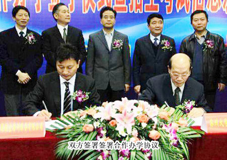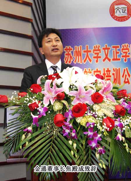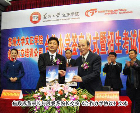 蘇州大學(xué)文正學(xué)院與金通航空培訓(xùn)簽署合作辦學(xué)協(xié)議 本網(wǎng)訊 隨著金通航空培訓(xùn)公司“校企合作”取得了可喜的成績,辦學(xué)規(guī)模日益擴(kuò)大,在業(yè)內(nèi)影響力逐年提升。今年,金通航空培訓(xùn)再添佳績,與享譽(yù)美名、學(xué)風(fēng)扎實的蘇州大學(xué)文正學(xué)院達(dá)成合作。 12月8日下午,金通航空培訓(xùn)公司與蘇州大學(xué)文正學(xué)院合作辦學(xué)簽約儀式暨招生考試信息發(fā)布會隆重舉行。眾多媒體對此給予了充分關(guān)注并進(jìn)行了深入報道。 蘇州大學(xué)黨委副書記、副校長江涌主持了此次會議,出席會議的嘉賓有金通航空培訓(xùn)公司董事長兼總經(jīng)理焦殿成、蘇州大學(xué)黨委書記王卓君、蘇州大學(xué)校長朱秀林、蘇州市教育局局長鮑寅初、文正學(xué)院副院長蔣峰等。 蘇州大學(xué)校長朱秀林在致辭中指出,簽署合作辦學(xué)協(xié)議,開啟了蘇州大學(xué)與金通航空培訓(xùn)服務(wù)有限公司的全面合作,預(yù)示了雙方“強(qiáng)強(qiáng)聯(lián)合、互惠雙贏”的全面開始。希望大家以聯(lián)合辦學(xué)為契機(jī),進(jìn)一步拓展合作空間,豐富合作內(nèi)容,為探索我國航空人才的教育與培養(yǎng)而努力奮斗! 金通董事長焦殿成在致辭中表示:隨著祖國民航業(yè)的快速發(fā)展,民航空乘人才作為民航系統(tǒng)的重要生產(chǎn)力,其選拔培養(yǎng)受到社會的廣泛關(guān)注。成為一名空中乘務(wù)員,是高校畢業(yè)生和家長展翅藍(lán)天的夢想。面對國家教育體制改革的良好趨勢,適逢我國民航業(yè)快速發(fā)展的有利契機(jī),校企之間真誠合作,攜手培養(yǎng)社會需要的高端人才,將是高等院校和企業(yè)科學(xué)發(fā)展的的必由之路、創(chuàng)新之路和希望之路。金通與蘇州大學(xué)文正學(xué)院采用校企合作辦學(xué)模式,共同開辦本科層次的藝術(shù)設(shè)計專業(yè)(空乘方向),是合作雙方認(rèn)真考察、縝密調(diào)研、履行正規(guī)批報程序所做出的科學(xué)決策。 隨后,殷愛蓀與焦殿成簽署合作協(xié)議,并互贈禮物。 文正學(xué)院是中國高等教育多元化探索的產(chǎn)物,是最早創(chuàng)辦的公有民辦二級學(xué)院之一,后改辦為獨(dú)立學(xué)院。自1998年開辦以來,文正學(xué)院依托“母體”學(xué)校的雄厚師資而存在,與蘇州大學(xué)研究型大學(xué)定位不同的是,文正學(xué)院結(jié)合區(qū)域經(jīng)濟(jì)發(fā)展的現(xiàn)實需要,培養(yǎng)應(yīng)用型本科人才。從為適應(yīng)城市交通發(fā)展開設(shè)城市軌道交通相關(guān)專業(yè),到為適應(yīng)民航業(yè)發(fā)展開設(shè)空乘專業(yè),都顯示了文正學(xué)院緊貼社會需求進(jìn)行人才培養(yǎng)的辦學(xué)思路和辦學(xué)實踐。 據(jù)悉,此次文正學(xué)院所開設(shè)的空乘專業(yè)為全日制藝術(shù)類本科,學(xué)制四年,計劃首屆在藝術(shù)類中招收200名空乘專業(yè)學(xué)生,將開設(shè)包括有民航發(fā)展史、客艙服務(wù)與管理、客艙設(shè)備使用與管理、民航乘務(wù)英語、民航空乘禮儀、客艙服務(wù)程序及標(biāo)準(zhǔn)動作實操等多門專業(yè)課程。同時,除常規(guī)教學(xué)外,文正學(xué)院還將為學(xué)生配置民航客機(jī)模擬訓(xùn)練艙、民航乘務(wù)員CBT教學(xué)軟件、含有世界所有民航客機(jī)模型182架等教學(xué)實訓(xùn)設(shè)備;為抓好學(xué)生教育管理工作,學(xué)院將設(shè)立空乘專業(yè)管理委員會,對學(xué)生實行半軍事化管理。學(xué)生通過文化與專業(yè)知識的學(xué)習(xí),接受空乘服務(wù)、英語、計算機(jī)等方面的技能訓(xùn)練,能夠熟練地運(yùn)用專業(yè)技能為顧客提供優(yōu)質(zhì)服務(wù),同時通過專業(yè)實習(xí)環(huán)節(jié)提升綜合素質(zhì),成為文化素養(yǎng)高、專業(yè)技能強(qiáng)的高級空乘、地勤人員。 此次新聞發(fā)布會的召開標(biāo)志著金通與文正學(xué)院的合作正式啟動,為文正學(xué)院藝術(shù)設(shè)計專業(yè)(空乘方向)的美好將來打下堅實基礎(chǔ)。相信若干年后,雙方所共同培養(yǎng)出的空乘學(xué)子們,一定會不負(fù)眾望,成為我國民航界的中堅力量!