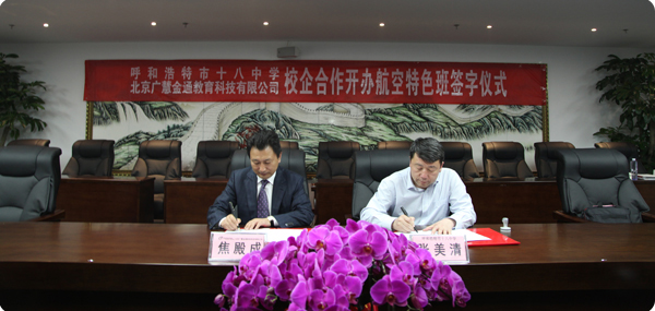 2014年4月26日,建立在校企合作、創(chuàng)新發(fā)展的基礎(chǔ)上,呼和浩特市第十八中學(xué)與北京廣慧金通教育科技有限公司就聯(lián)合舉辦“校企合作(高中起點(diǎn))定向培養(yǎng)航空飛行員和乘務(wù)員、安全員”項(xiàng)目簽訂了《合作辦學(xué)協(xié)議》。在雙方的共同努力下,合作項(xiàng)目正式啟動(dòng)并順利實(shí)施,在逐步健全和完善校企合作機(jī)制上取得了實(shí)質(zhì)性進(jìn)展,已經(jīng)在此項(xiàng)目開(kāi)拓發(fā)展上處于全國(guó)同類高級(jí)中學(xué)建設(shè)與發(fā)展的前列。