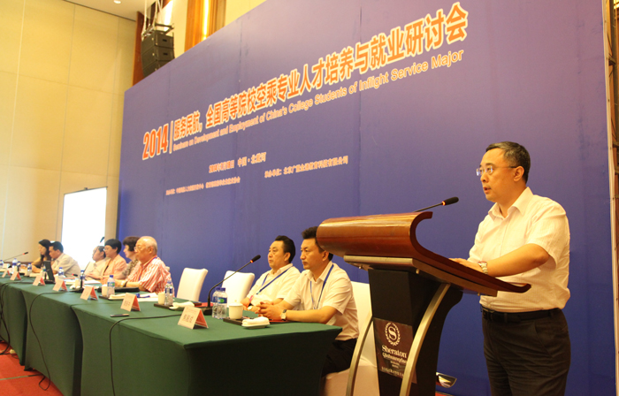 首先,教育部高校畢業(yè)生就業(yè)協(xié)會(huì)副理事長(zhǎng)、教育部學(xué)生司原司長(zhǎng)王熾昌致辭。王副理事長(zhǎng)談到:近年來(lái),國(guó)家對(duì)于現(xiàn)代職業(yè)教育的發(fā)展非常重視,國(guó)務(wù)院2014年發(fā)布《關(guān)于加快發(fā)展現(xiàn)代職業(yè)教育的決定》,提出“推進(jìn)人才培養(yǎng)模式創(chuàng)新”的觀點(diǎn)。王司長(zhǎng)認(rèn)為,堅(jiān)持校企合作、工學(xué)結(jié)合,強(qiáng)化教學(xué)、學(xué)習(xí)、實(shí)訓(xùn)相融合的教育教學(xué)活動(dòng),形成適應(yīng)發(fā)展需求的現(xiàn)代職業(yè)教育體系,正式此次研討會(huì)需要討論的主題和意義,并應(yīng)利用這次機(jī)會(huì)貫徹學(xué)習(xí)國(guó)務(wù)院發(fā)布的決定。各高校應(yīng)將提高職業(yè)技能和培養(yǎng)職業(yè)精神高度融合,樹立正確的人才觀。要培養(yǎng)服務(wù)意識(shí)強(qiáng),愛(ài)崗敬業(yè)的航空服務(wù)專業(yè)人才。