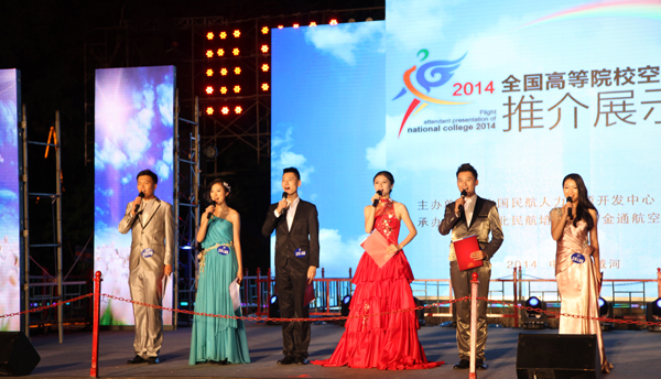 2014年7月12日晚20時(shí),由中國(guó)民航人力資源開(kāi)發(fā)中心主辦、華北民航培訓(xùn)中心/金通航空培訓(xùn)中心承辦的“2014年全國(guó)高等院校空乘專(zhuān)業(yè)推介展示會(huì)”在華北民航培訓(xùn)中心隆重啟幕。