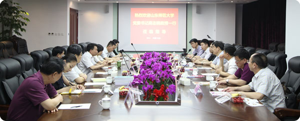 5月28日下午山東師范大學(xué)黨委書記商志曉、政治與國(guó)際關(guān)系學(xué)院院長(zhǎng)馬永慶、黨委辦公室主任邢光、國(guó)際交流合作處處長(zhǎng)周連勇、實(shí)驗(yàn)與管理設(shè)備處處長(zhǎng)楊志強(qiáng)、美術(shù)學(xué)院黨委書記宋吉國(guó)一行來(lái)廣慧金通教育科技有限公司座談交流。公司董事長(zhǎng)焦殿成、副總經(jīng)理付曉軍,盛美蘭、招生工作部經(jīng)理焦殿龍、招生工作處主任梁平等出席座談會(huì)。
