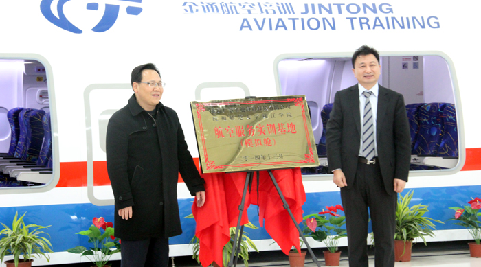 隨后,劉金華院長、焦殿成董事長等6位領導共同為實訓中心剪彩,并共同為航空服務實訓基地(模擬艙)揭牌。學院領導、公司領導和分院領導、空乘專業(yè)學生代表共同見證了這具有重要意義的時刻。
