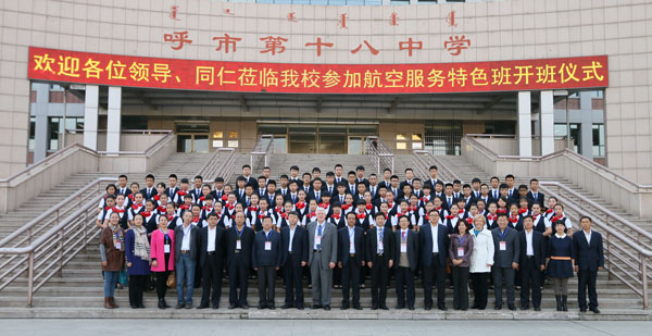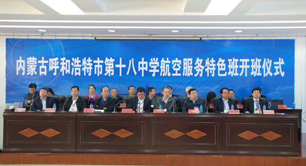 2014年10月24日上午10時(shí),內(nèi)蒙古自治區(qū)高中起點(diǎn)空乘專業(yè)特長(zhǎng)班——“呼和浩特市第十八中學(xué)航空服務(wù)特色班”開(kāi)班儀式在本校八樓會(huì)議室隆重開(kāi)幕。內(nèi)蒙教育廳基礎(chǔ)教育處副處長(zhǎng)曹軼明,內(nèi)蒙古師范大學(xué)副校長(zhǎng)張海峰,呼市教育局副局長(zhǎng)柏俊,賽罕區(qū)教育局局長(zhǎng)高峰,中國(guó)國(guó)際航空內(nèi)蒙古公司黨委書(shū)記常國(guó)軍,內(nèi)蒙古自治區(qū)政協(xié)常委、呼和浩特機(jī)場(chǎng)集團(tuán)副總經(jīng)理李蘭英,鄂爾多斯機(jī)場(chǎng)管理集團(tuán)副董事長(zhǎng)張宏、中國(guó)南方航空公司招飛中心胡濤主任、中國(guó)東方航空江蘇有限公司招飛辦主任王振根、鄂爾多斯機(jī)場(chǎng)管理集團(tuán)副總經(jīng)理兼鄂爾多斯機(jī)場(chǎng)總經(jīng)理于洪衛(wèi)、內(nèi)蒙古自治區(qū)公安廳高速交警支隊(duì)支隊(duì)長(zhǎng)楊立國(guó),美國(guó)加州州立(波莫納)理工大學(xué)院長(zhǎng)霍華艾文斯及夫人等20余位嘉賓和內(nèi)蒙古日?qǐng)?bào)社等幾大新聞媒體的記者應(yīng)邀參加了開(kāi)班儀式。呼和浩特市第十八中學(xué)空乘班的師生和家長(zhǎng)列席會(huì)議,大家在此共同見(jiàn)證了十八中跨越發(fā)展的又一重要?dú)v史時(shí)刻。