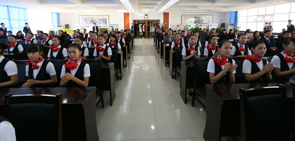 儀式開(kāi)始,在熱烈的掌聲中北京廣慧金通教育科技有限公司焦殿成董事長(zhǎng)和呼市十八中張美清校長(zhǎng)共同為十八中航空飛行員、乘務(wù)員培養(yǎng)基地落成揭牌。其后,高峰局長(zhǎng)、張海峰副校長(zhǎng)等依次致辭,焦殿成董事長(zhǎng)和十八中李貴福副校長(zhǎng)分別代表合作雙方講話,空乘班學(xué)生楊洋同學(xué)也代表學(xué)生發(fā)言。莊嚴(yán)緊湊的開(kāi)班儀式結(jié)束,嘉賓和家長(zhǎng)們興致勃勃地參觀了空乘實(shí)訓(xùn)教室,觀摩了專業(yè)課課堂,滿意的笑容不時(shí)綻放,嘖嘖的贊嘆不絕于耳。
