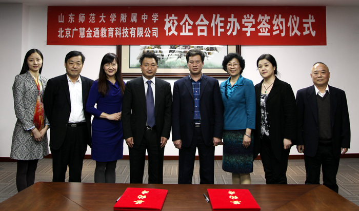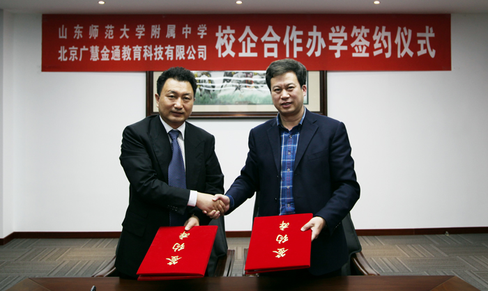 4月20日,山東師范大學(xué)附屬中學(xué)與北京廣慧金通教育科技有限公司校企合作辦學(xué)簽約儀式在北京總部舉行。山東師范大學(xué)附屬中學(xué)校長(zhǎng)王玉璋,北京廣慧金通教育科技有限公司董事長(zhǎng)焦殿成,付總經(jīng)理付曉軍等領(lǐng)導(dǎo)出席了簽約儀式。