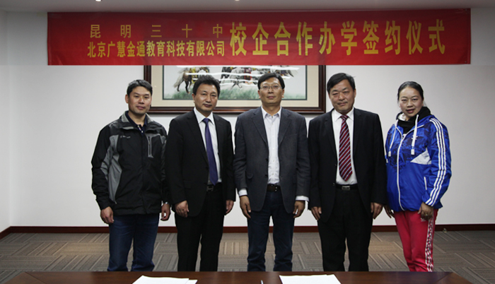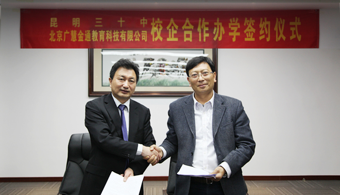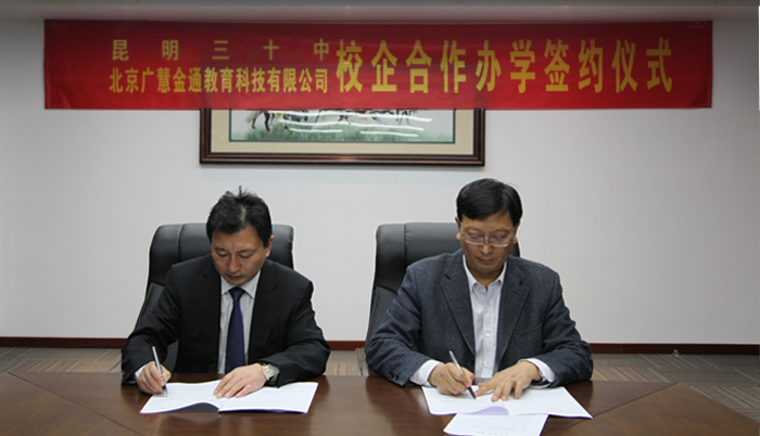 昆明三十中校長(zhǎng)田盛洪、北京廣慧金通教育科技有限公司董事長(zhǎng)焦殿成代表雙方在合作協(xié)議上簽字。