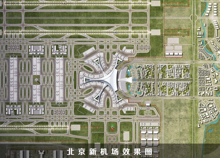 2014年12月26日,北京新機場工程舉行開工典禮,2015年全面開工,并將于2019年7月1日開始試運轉(zhuǎn)。截止2015年5月,拆遷文件均已下發(fā)給當?shù)鼐用,搬遷過后,新機場在2015年9月全面動工。2015年9月22日,北京新機場從多個方案確定了“海星”設(shè)計方案。