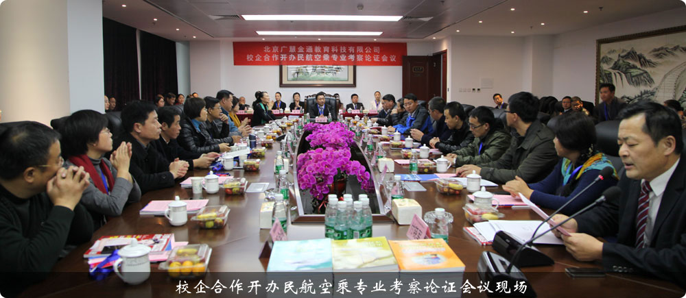 2015年11月19日,在北京廣慧金通教育科技有限公司總部,來自江西師范大學(xué)、貴州師范大學(xué)、海南師范大學(xué)、江西科技師范大學(xué)、大連交通大學(xué)、黑河學(xué)院、遼寧警察學(xué)院、遼東學(xué)院、河北民族師范學(xué)院、貴州大學(xué)科技學(xué)院、武漢工商學(xué)院、沈陽城市學(xué)院、蘭州工業(yè)學(xué)院、蕪湖職業(yè)技術(shù)學(xué)院、廣東科學(xué)技術(shù)職業(yè)學(xué)院、西安航空職業(yè)技術(shù)學(xué)院、山東濱州學(xué)院、新疆農(nóng)業(yè)大學(xué)科技學(xué)院、江蘇廣播電視大學(xué)海安學(xué)院、秦皇島職業(yè)技術(shù)學(xué)院等全國各省市的22所高等院校相關(guān)領(lǐng)導(dǎo),共同參加由北京廣慧金通教育科技有限公司組織召開的“校企合作開辦民航空中乘務(wù)專業(yè)考察論證會議”。北京廣慧金通教育科技有限公司董事長焦殿成、教育部高校畢業(yè)生就業(yè)協(xié)會空乘分會會長王小娟、江西師范大學(xué)副校長趙明、貴州師范大學(xué)副校長劉肇軍、江西科技師范大學(xué)副校長胡業(yè)華、遼寧警察學(xué)院副校長米佳、武漢工商學(xué)院副校長夏再興、沈陽城市學(xué)院黨委書記孫永新、海南師范大學(xué)教務(wù)處處長梁廣、黑河學(xué)院教務(wù)處處長許海深、貴州大學(xué)科技學(xué)院教務(wù)處處長趙鵬、河北民族師范學(xué)院教務(wù)處處長王偉、江蘇廣播電視大學(xué)海安學(xué)院副院長唐素云、遼東學(xué)院外國語學(xué)院黨總支書記姜長丹、山東濱州學(xué)院乘務(wù)學(xué)院院長宮新軍、蘭州工業(yè)學(xué)院人文社會科學(xué)學(xué)院院長張小華、大連交通大學(xué)經(jīng)濟管理學(xué)院黨總支書記關(guān)英、新疆農(nóng)業(yè)大學(xué)科技學(xué)院教務(wù)處處長霍世剛、蕪湖職業(yè)技術(shù)學(xué)院合作辦主任王世友、蕪湖職業(yè)技術(shù)學(xué)院附屬中專學(xué)校書記兼校長鄔余俊、秦皇島職業(yè)技術(shù)學(xué)院教研室主任楊振秋、西安航空職業(yè)技術(shù)學(xué)院航空管理學(xué)院院長韓春梅和來自22所高校的46名領(lǐng)導(dǎo)和嘉賓,以及北京廣慧金通教育科技有限公司的各級領(lǐng)導(dǎo)和員工,計百余名人員參加了此次考察論證會議,會議由公司董事長助理兼校企合作部總經(jīng)理付曉軍主持。